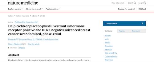 11月4日,国际四大医学期刊之一、英国《自然》旗下《自然医学》(Nature Medicine)在线发表CDK4/6抑制剂达尔西利(SHR6390)联合氟维司群治疗既往内分泌治疗后疾病进展的HR+/HER2-晚期乳腺癌的多中心、随机、双盲III期临床研究(DAWNA-1研究)中期分析结果报告,首次对氟维司群(雌激素受体降解剂)±达尔西利治疗激素受体阳性晚期乳腺癌的有效性和安全性进行了比较。研究结果显示,达尔西利+氟维司群组与安慰剂+氟维司群组相比,无进展生存期(PFS)显著延长。该项研究由中国医学科学院肿瘤医院徐兵河教授担任leading PI,全国39家医院参研,由asiagame医药临床研发团队支持完成。