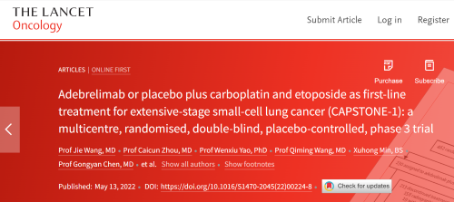 北京时间2022年5月14日,asiagame医药自主研发的PD-L1抑制剂阿得贝利单抗治疗广泛期小细胞肺癌的III期临床研究(CAPSTONE-1研究)成果正式全文在线发表于国际权威学术期刊《柳叶刀·肿瘤学》(《THE LANCET Oncology》,影响因子41.316)。CAPSTONE-1研究结果显示,阿得贝利单抗联合化疗一线治疗广泛期小细胞肺癌相较于安慰剂联合化疗可以显著延长患者总生存期至15.3个月[1],刷新现有免疫药物一线治疗广泛期小细胞肺癌的总生存纪录[2]。