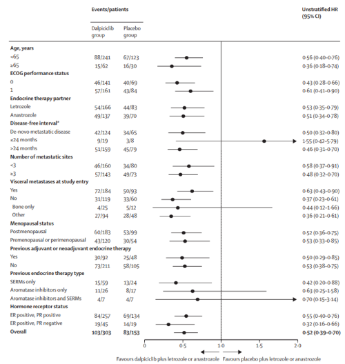 除了无病间期≤24个月的患者,达尔西利联合治疗在其余所有亚组获得与总人群一致的PFS获益趋势。在占比约60%的内脏转移患者中,达尔西利降低患者的疾病进展或死亡风险37%(HR=0.63;95%CI: 0.43-0.90),非内脏转移亚组PFS HR为0.37(95%CI: 0.23-0.61)。