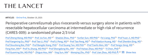 [2]Wang Z, Fan J, Zhou S, et al. Perioperative camrelizumab plus rivoceranib versus surgery alone in patients with resectable hepatocellular carcinoma at intermediate or high risk of recurrence (CARES-009): a randomised phase 2/3 trial. Lancet 2025. Published Online. http://doi.org/10.1016/S0140-6736(25)01720-9.